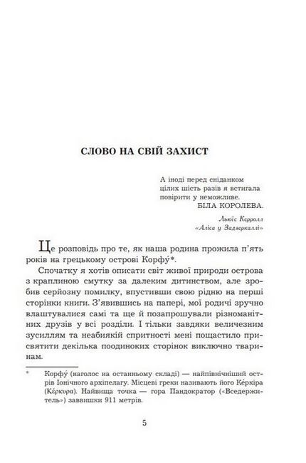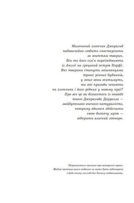 Перша частина середземноморської трилогії (наступна — «Птахи, звірі та родичі», остання — «Сад богів») відомого британського письменника-анімаліста, зоолога Джеральда Малькольма Даррелла, присвячена золотим часам дитинства автора на грецькому острові Корфу.