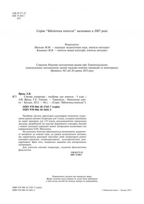 Посібник для вчителя Світова література 5 клас Авт: Ярець Л.В. та ін. Вид-во: Богдан 83094