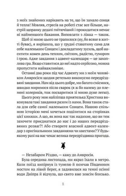 Різдво починається тоді, коли його відчуває наше серце. І в цьому очікуванні дива важливо бути поряд із тими, кого любимо, і дарувати світло тим, хто його потребує. Герої книжки створили власний адвент-календар. Щодня оповідачка, її чоловік Амвросій та приятелька Христина вигадують одне для одного завдання, які не тільки примножують радість, а й відкривають чимало нового зі світу культури. Цей затишний адвент-календар подарує віру в диво, яке неодмінно здійсниться, і стане для вас інтелектуальною грою-мандрівкою, у якій вільно й невимушено поєднуються особистості української та інших європейських культур. І будьте певні: під час виконування цих передріздвяних завдань зовсім не соромно зізнатися, що ти чогось не знаєш.