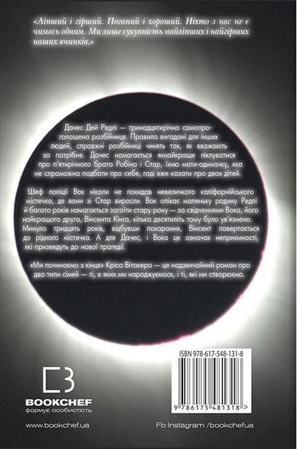 Дачес Дей Редлі — тринадцятирічна самопроголошена розбійниця. Правила вигадані для інших людей, справжні розбійниці чинять так, як вважають за потрібне. Дачес намагається якнайкраще піклуватися про п’ятирічного брата Робіна і Стар, їхню мати-одиначку, яка не спроможна подбати про себе, годі вже казати про двох дітей. Шеф поліції Вок ніколи не покидав невеличкого каліфорнійського містечка, де вони зі Стар виросли. Вок опікає маленьку родину Редлі й багато років намагається загоїти стару рану — за свідченнями Вока, його найкращого друга, Вінсента Кінга, кілька десятиліть тому було ув’язнено. Минуло тридцять років, відбувши покарання, Вінсент повертається до рідного містечка. А для Дачес, і Вока це означає неприємності, які призведуть до нової трагедії. «Ми починаємо з кінця» Кріса Вітакера — це надзвичайний роман про два типи сімей — ті, в яких ми народжуємося, і ті, які ми створюємо.