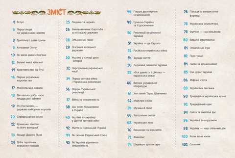 Книжка розповідає про перших людей на українських землях, про поселення давніх слов’ян, про князів, козаків… і так аж до президентів. У цій мандрівці читачі дізнаються також про знакові місця, культурну спадщину та досягнення українців у різних галузях.