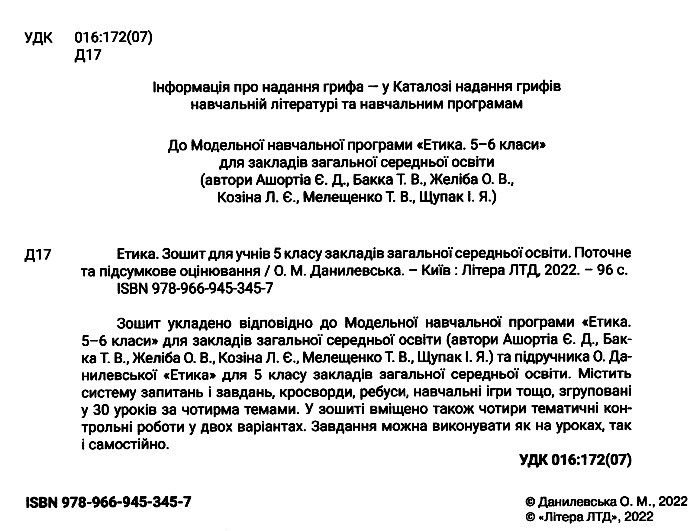 Зошит. Етика Поточне і підсумкове оцінювання. 5 клас НУШ Данилевська О. Літера