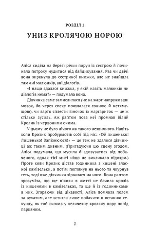 «Аліса в Країні Див» — казкова повість Льюїса Керрола, яка вже понад 150 років захоплює, дивує і надихає дітей та дорослих у всьому світі. Перекладена багатьма мовами, не раз екранізована, адаптована й безліч разів переказана, ця історія досі не втратила актуальності. Химерні пригоди, дивовижні істоти та несподівані повороти причаровують читачів і читачок покоління за поколінням. Варто лишень зазирнути у кролячу нору — і мандрівка Країною Див розпочнеться. З кожною сторінкою все дивуватіше й дивуватіше!