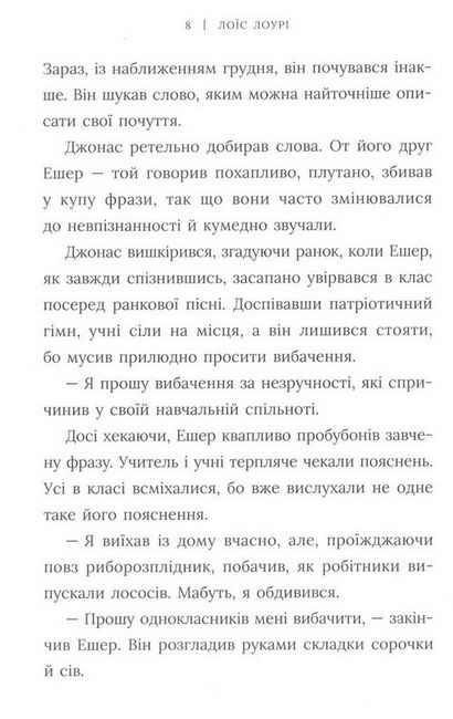 Та Джонаса чекає дещо особливе. Його навчанням буде займатися загадкова людина – Хранитель. Саме він тримає у собі спогади про справжні людські почуття: біль, радість, задоволення та інші. Як же вплине на хлопчика сприйняття реальних відчуттів і чи це змінить його? Дізнавайтеся зі сторінок книги.