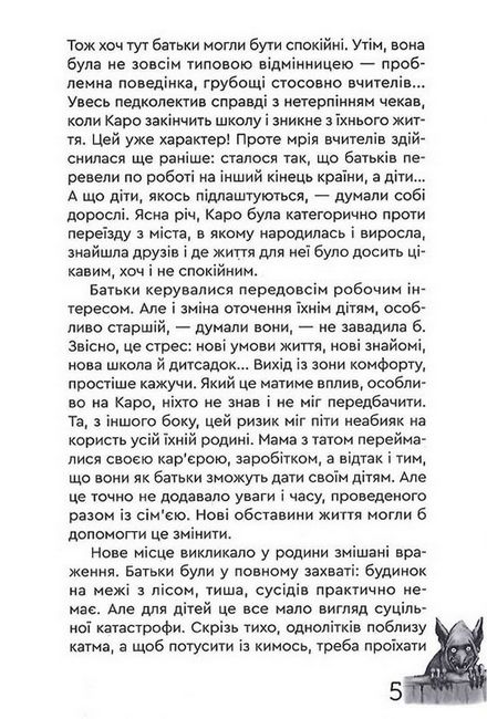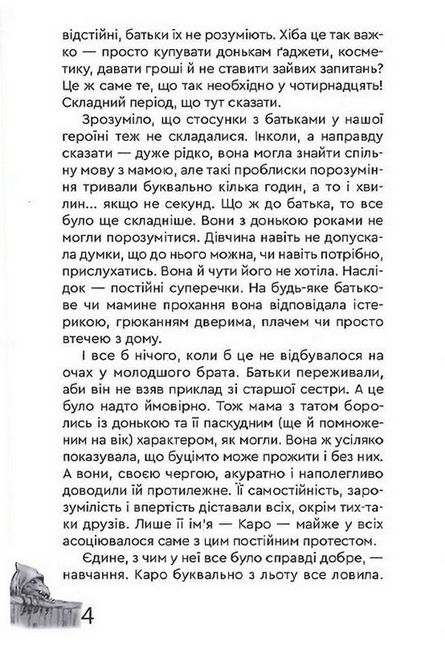 Саме у книзі "Каро і Потаємний Світ" авторка оповідає нам історію дівчинки-підлітка Каро, яка не знаходить підтримку батьків і намагається зрозуміти себе, прислухатись до своїх бажань. І от коли усе щойно почало налагоджуватись зі школою, коли у Каро з'явився справжній друг, якому вона може довіритись, отак серед білого дня на прогулянці, з озера вилазить чудовисько і краде твою близьку людину.