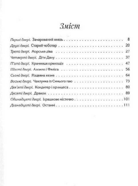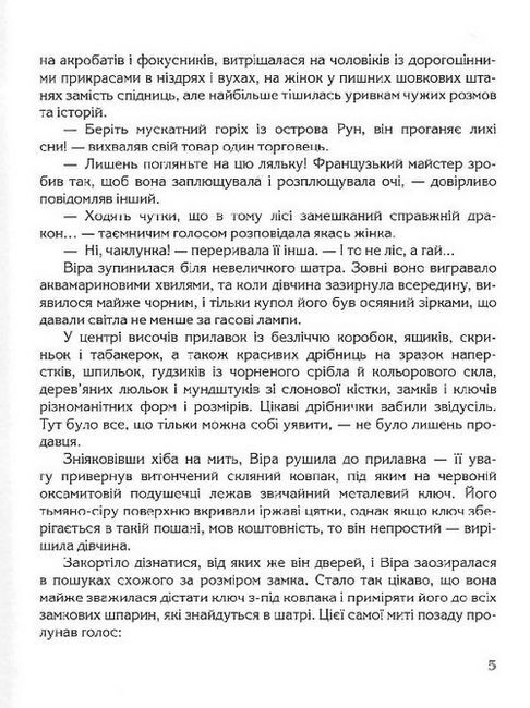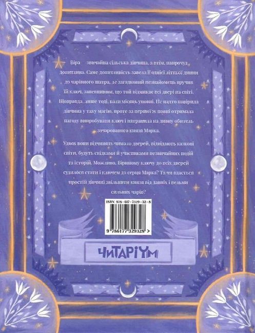 Головна героїня книги “Ключ до всіх дверей” Віра — звичайна сільська дівчина, а втім, напрочуд допитлива. Саме допитливість завела її однієї літньої днини до чарівного шатра, де загадковий незнайомець вручив їй ключ, запевнивши, що той відмикає всі двері на світі. Щоправда, лише тоді, коли місяць уповні. Не надто повірила дівчина у таку магію, проте за першої ж повні отримала нагоду випробувати ключ і натрапила на дивну обитель зачарованого князя Марка. Удвох вони відчинять чимало дверей, відвідають казкові світи, будуть свідками й учасниками незвичайних подій та історій. Можливо, Віриному ключу до всіх дверей судилося стати і ключем до серця Марка? Та чи вдасться простій дівчині звільнити князя від давніх і вельми сильних чарів?