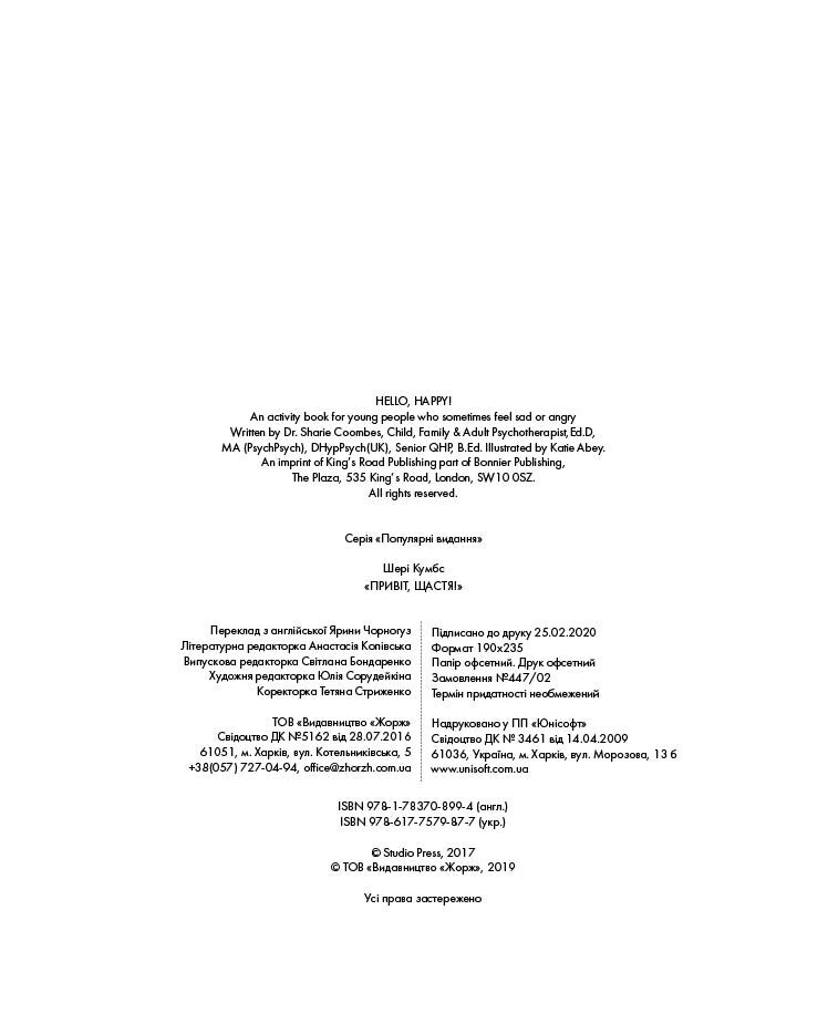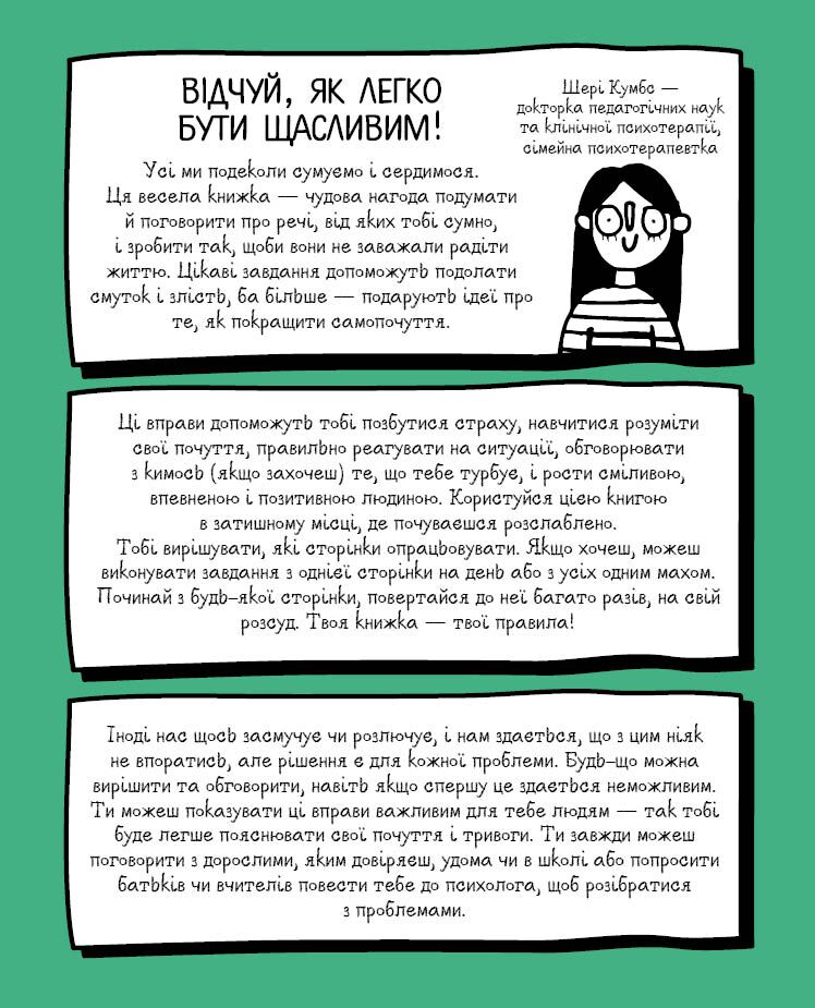 Привіт, щастя! Шері Кумбс Ранок. Усі ми подеколи сумуємо і сердимося. Ця весела книжка із заняттями — чудова нагода подумати й поговорити про речі, від яких тобі сумно, і зробити так, щоби вони не заважали радіти життю. Цікаві завдання допоможуть подолати смуток і злість, ба більше — подарують ідеї про те, як покращити самопочуття.