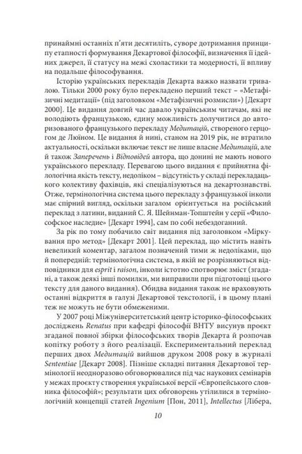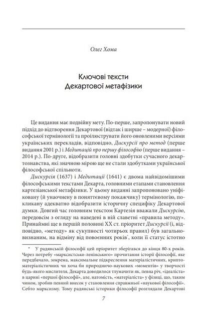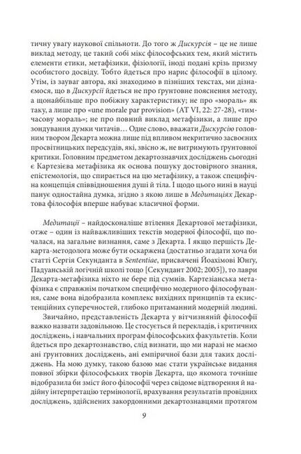 Рене Декарт (1596–1650), видатний французький філософ, відомий передовсім як творець першої метафізики Нового часу, мислитель, що визначив поле дискусій новочасної філософії в цілому. «Дискурсія про метод» і «Медитації про першу філософію» є ключовими текстами цієї метафізики. Це видання вперше подає українські переклади зазначених творів під однією обкладинкою.