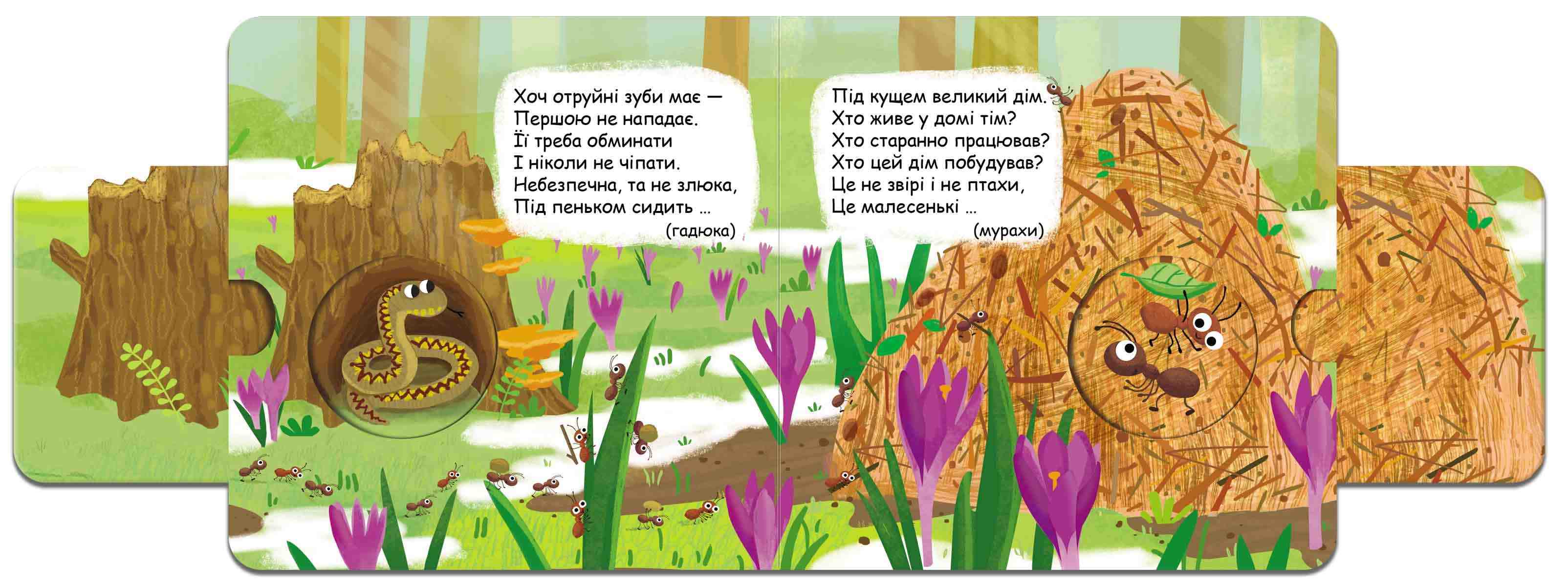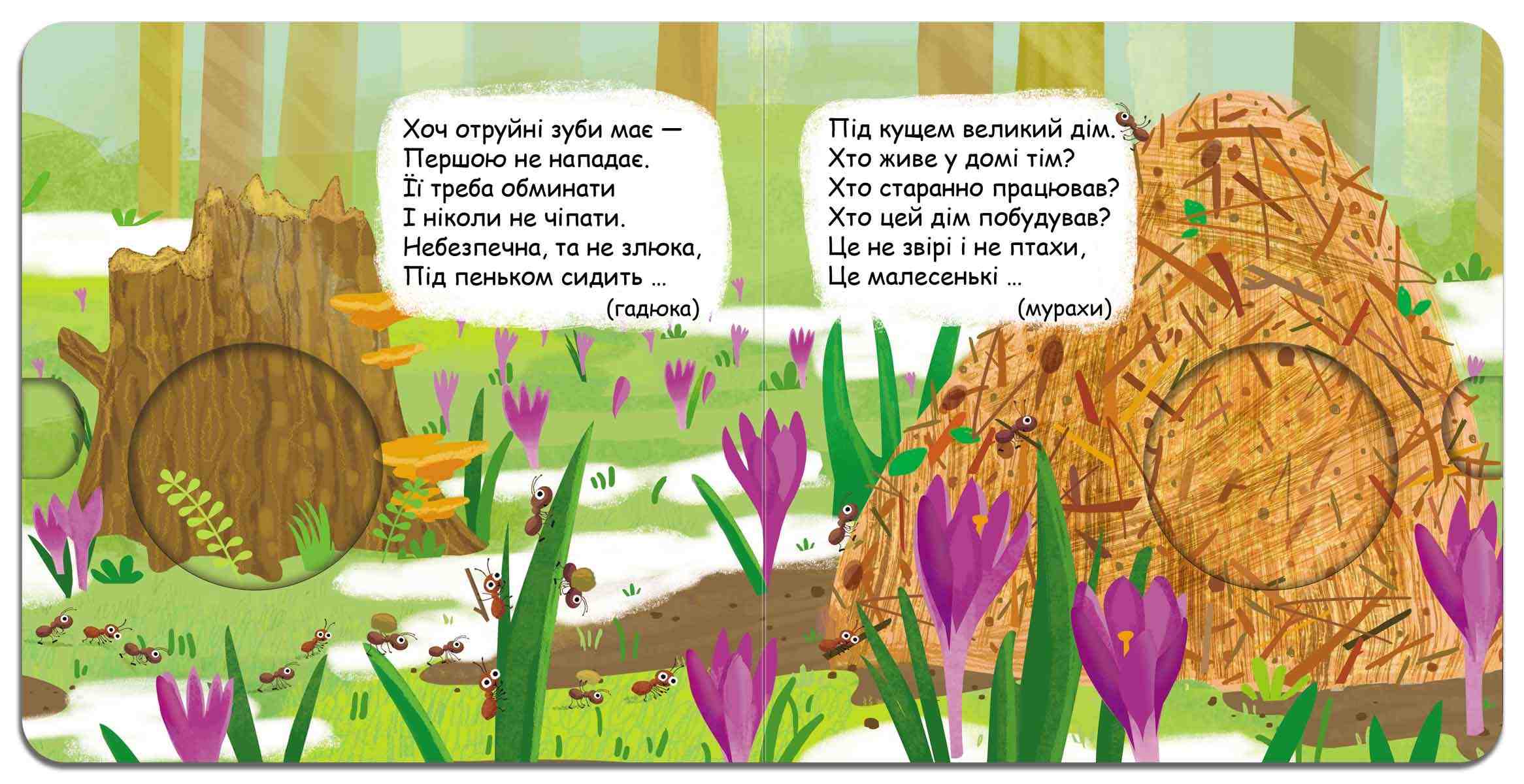 До серії Книжка-схованка входять книжки, що містять цікаві розвивальні загадки. Відгадка ховається на висувному малюнку. Розглядаючи малюнки, ставте дитині запитання про зображене, про його колір та розмір, характерні особливості зображеного.