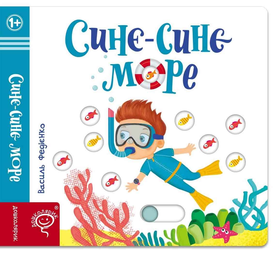 Синє-синє море Сторінки цікавинки. Книга познайомить дітей із найпоширенішими морськими мешканцями, які намальовані на кожній сторінці, а також із видами водного транспорту. Коротенькі вірші-загадки містять опис риб, крабів, восьминогів, черепах, птахів та ссавців, які мешкають біля водойм. А також допоможуть малюкові здогадатися, про кого йдеться, перш ніж він побачить відповідь, яка ховається під рухливими елементами.