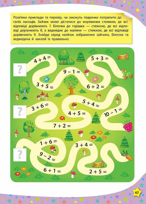 280 розумних наліпок Пишу Читаю Рахую 4–5 років. Із цією книжкою ваша дитина навчиться писати друковані літери українського алфавіту, малювати різні типи ліній, фігури, орнаменти й предмети по пунктиру та клітинках. Малюк зможе пригадати числа від 1 до 10 та основні геометричні фігури, навчитися вимірювати довжину предметів за допомогою лінійки, порівнювати предмети й числа, розв’язувати прості приклади й задачі. Дитина також потренується складати слова зі складів, а речення зі слів за допомогою малюнків та наліпок і, звичайно, читати по складах слова й речення. Завдання в книжці передбачають роботу з наліпками, що неодмінно сподобається дитині.