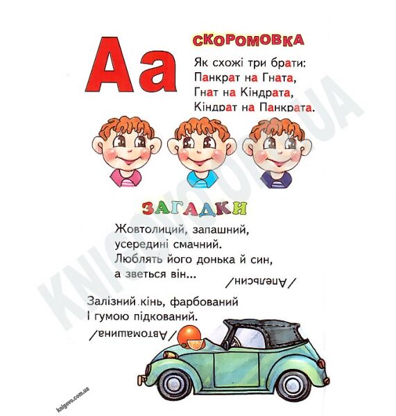 Цікаві та змістовні вірші, а також чудові малюнки, разом з якими оживають усім нам знайомі предмети, і букви стають дієвими персонажами книги, допоможуть малятам завчити літери, а веселі загадки розраховані на те, щоб діти легко та залюбки повторили всі букви.