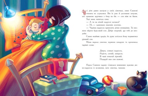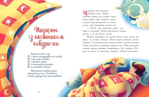\nКнижка містить казки, які рекомендовано читати дітям перед сном. Слухаючи казку, малюк заспокоюється, поринає в приємні спогади, мрії, мандрує разом із персонажами до чарівного ресторану-цукерні «На добраніч», у країну Сновиландія та навіть опускається на самісіньке морське дно!