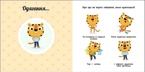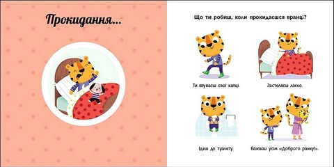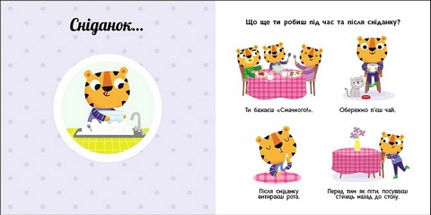 Як розпочинається твій день? Що ти робиш за сніданком? Що варто не забути зробити у ванній кімнаті? Як зібратися до садочка? Обертай колесо та дізнавайся про свій розпорядок дня. Один оберт — і тигреня прокинулося, ще один — почистило зубки… Навчайтеся цікаво й весело з книжками серії!