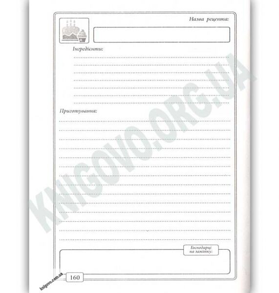 Тепер ви можете створити власну кулінарну книгу, куди будете записувати улюблені рецепти, робити пам’ятки, вкладати в неї весь свій досвід. Ця книга завжди буде у вас під рукою й на довгі роки стане вірним помічником на кухні, нодругою-порадницею й сімейною реліквією одночасно! Виявите фантазію і ваше меню завжди буде різноманітним і не схожим на інші!