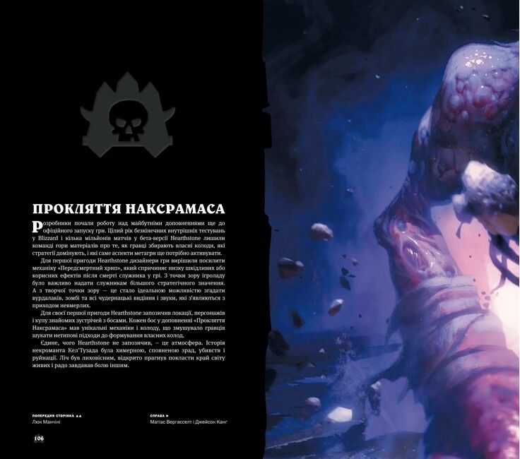 «Світ Hearthstone» пропонує заглибитись у творчий процес, який перетворив шалено популярну колекційну карткову гру на світовий феномен. Ця книга відкриває читачам захопливі деталі візуальної складової гри: від досі небачених концептів з ранньої розробки Hearthstone до сотень чарівних і фантастичних ілюстрацій, які захопили уяву гравців. Вона також розповість, як створювали Hearthstone, і як з маленького командного проєкту виросла успішна світова гра, що об’єднала понад 30 мільйонів гравців.