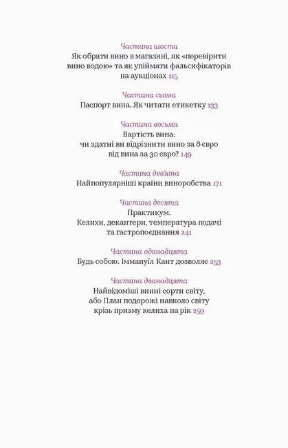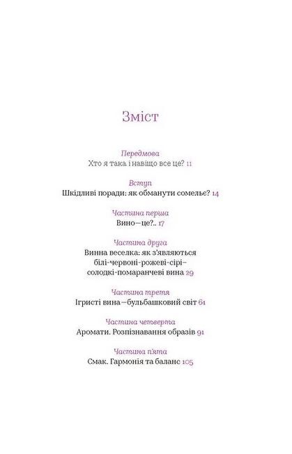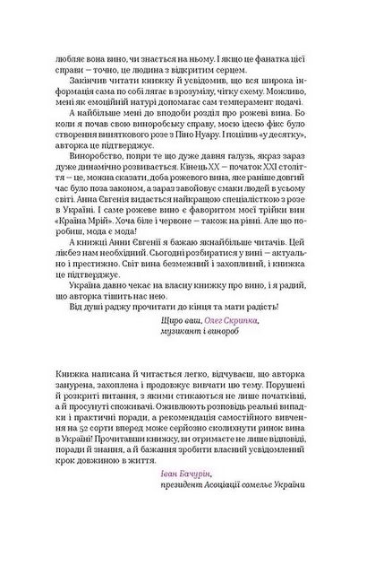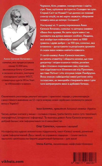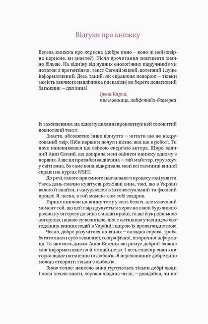 У своїй книжці Анна Євгенія пояснює, як читати етикетку і обирати келихи, що таке декантер і звідки взялися таніни, розвіює міфи стосовно порошкових вин, пояснює, чим відрізняється Шампанське від Проссеко, що таке Петнат і хто зіпсував імідж Ламбруско. Вона описує найвідоміші винні регіони світу та пояснює, як винороби створюють вино і для чого витримувати вино в дубових бочках.