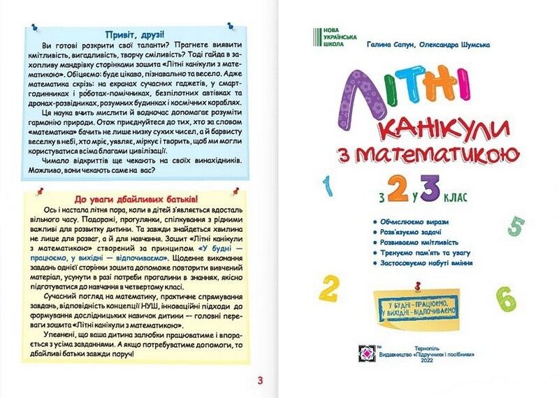 У зошиті запропоновано навчальні та розвивальні завдання, що охоплюють базовий матеріал з математики 2 класу та відповідають вимогам Державного стандарту початкової освіти та типових освітніх програм (за редакцією О. Савченко та за редакцією Р. Шияна). Дібрані вправи розвивають мислення, математичні здібності, додають навчальному матеріалу практичного спрямування, формують дослідницькі вміння дитини, розуміння явищ довкілля. Кілька хвилин щоденного виконання завдань за принципом «У будні — працюємо, у вихідні — відпочиваємо» допоможуть улітку повторити вивчений матеріал, удосконалити отримані навички та підготуватися до подальшого навчання.