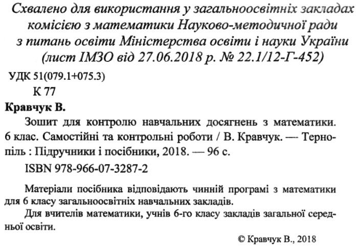 Контроль навчальних досягнень Математика 6 клас Нова програма Авт: Кравчук В. Вид-во: Підручники і посібники 19657