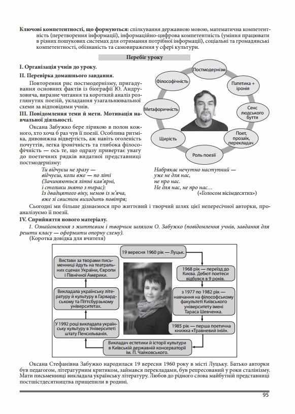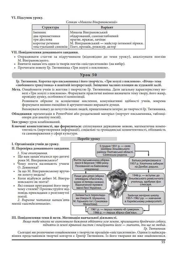 Посібник складається з детальних розробок уроків української літератури для 11 класу рівня стандарту відповідно до чинної оновленої програми Міністерства освіти і науки України та з огляду на тенденції, закладені в концепції реформування середньої освіти «Нова українська школа». Розроблені плани-конспекти допоможуть учителям творчо підійти до розкриття тем, пов’язаних із літературним життям України в середині ХХ ст. на початку XXI ст.