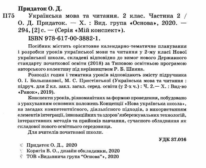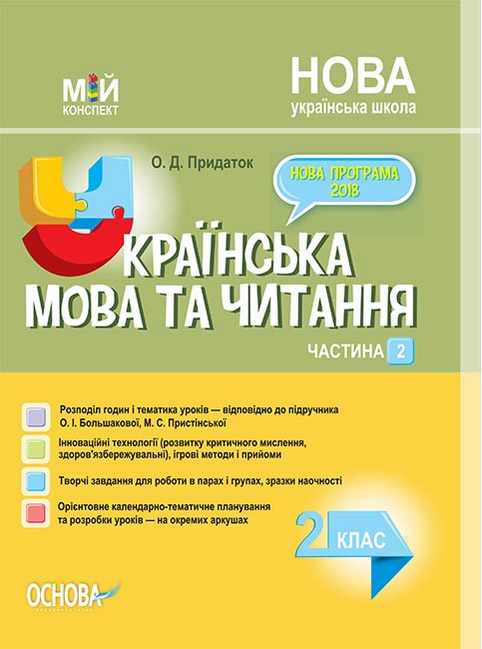 Мій конспект Українська мова та читання 2 клас Частина 2 НУШ За підручником О. Большакової, М. Пристінської Основа. Посібник містить орієнтовне календарно-тематичне планування і розробки уроків української мови та читання у 2-му класі Нової української школи, складені відповідно до вимог нового Державного стандарту початкової освіти (2018) за Типовою освітньою програмою авторського колективу під керівництвом Р. Б. Шияна.