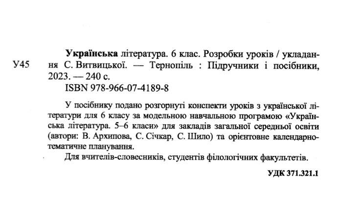 У посібнику подано розгорнуті конспекти уроків з української літератури для 6 класу за модельною навчальною програмою «Українська література. 5–6 класи» для закладів загальної середньої освіти (автори: В. Архипова, С. Січкар, С. Шило), та орієнтовне календарно-тематичне планування.