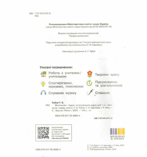 Підручник Мистецтво 1 клас НУШ Авт: Рубля Т.Є. та ін. Вид-во: Ранок 101621