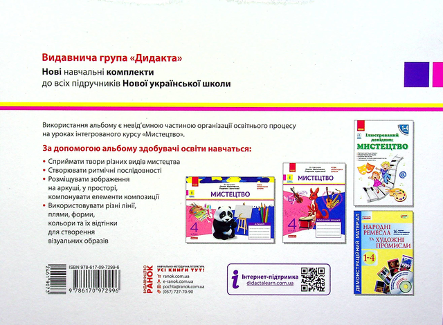 Нова українська школа ДИДАКТА Мистецтво 4 клас Альбом До підручника О. Калініченко, Л. Аристової НУШ Наземнова Т. Ранок. Альбом є частиною навчально-методичного комплекту "Мистецтво" для 4 класу ЗЗСО до підручника О. Калініченко, Л. С. Аристової. Посібник містить практичний матеріал з різних видів образотворчого мистецтва і реалізує компетентнісний підхід до освітнього процесу в початковій школі.