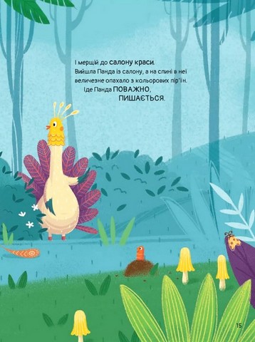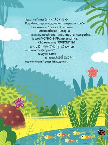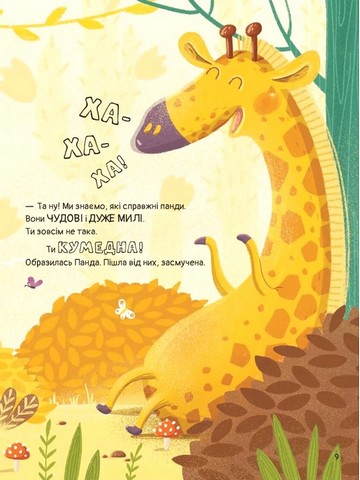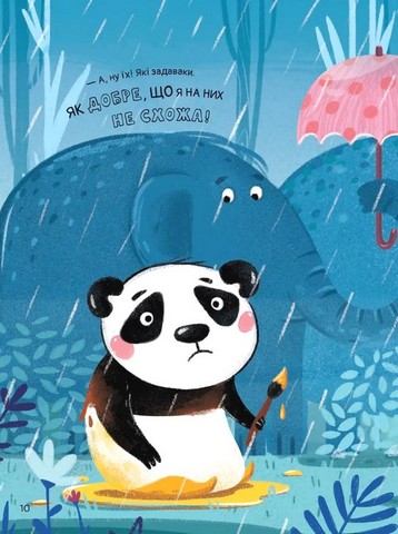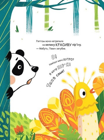 Панда хотіла бути красунею. Такою, як плямисті жирафи. Чи як черепахи — можливо, річ саме в їхньому панцирі? Чи, може, краще причепити собі пір’я, як у павича?