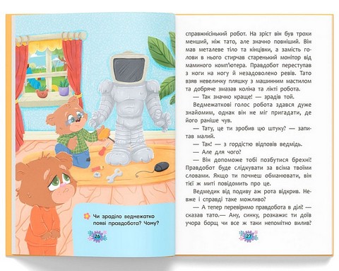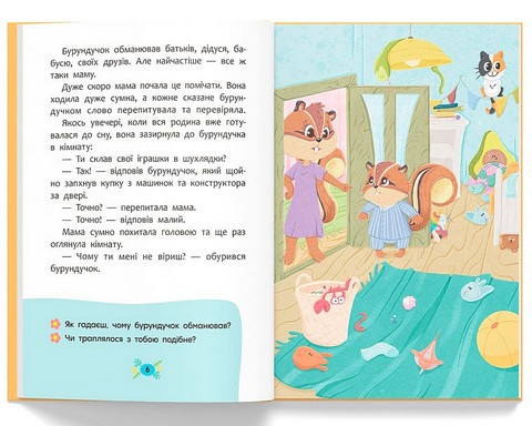 Ця книжка — незвичайна, вона повчальна. У ній ти знайдеш три історії про звірят, які почали обманювати: хтось із цікавості, хтось — щоб уникнути покарання, а хтось — просто так, бо здавалося, що це дрібничка. Та згодом маленькі герої дізналися, що брехня обриває ниточку довіри між близькими. На щастя, кожне звірятко знайшло спосіб повернути правду у своє життя та перестати обманювати. Хочеш дізнатися, як їм це вдалося? Розгортай книжку й читай історії про звірят, які навчилися говорити правду.