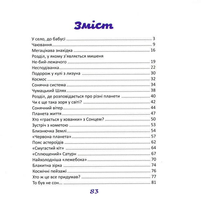 Читач разом з героями дізнається, як виглядають планети Сонячної системи, яка маса Сонця, кого називають близнючкою Землі та за скільки років можна перетнути Галактику. Книга, наче Всесвіт зірочками, поцяткована добрими жартами, приказками та дитячими відкриттями.