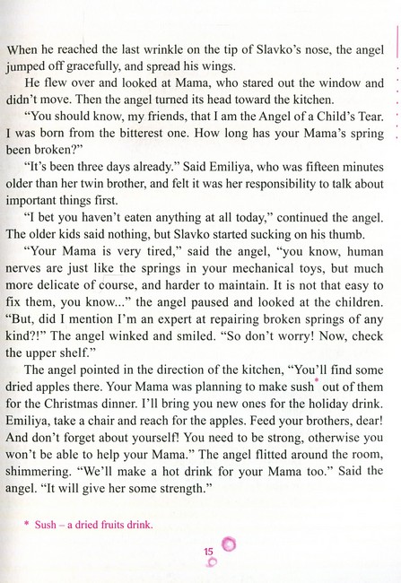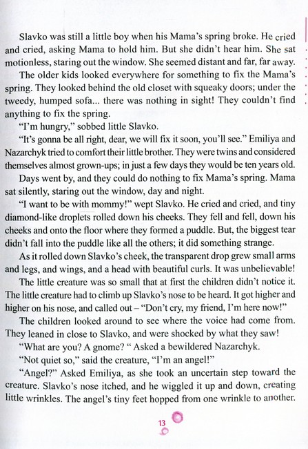 Збірка розповідає історії про дітей, яких спіткала нелегка доля, та про їхню беззаперечну надію на краще. Часом журливі, та водночас і радісні, сповнені любові та янгольського захисту оповідання. Книга залишає післясмак віри в диво - диво, яке цілком у наших руках. Для дітей і дорослих, які вірять у янголів. Українською та англійською мовами.
