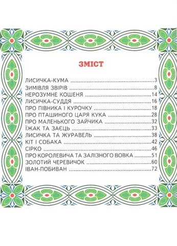 У цій книжці зібрані відомі українські народні казки. У них добро завжди перемагає зло, розумний дурного, сміливий — боягуза, а жадібність та зневага до інших караються. На прикладах казкови> персонажів діти зможуть осягнути складний світ людських взаємин.