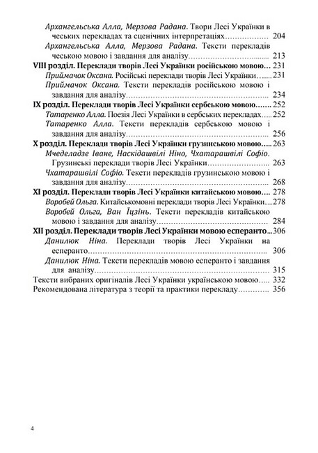 До навчального посібника ввійшли статті про переклади творів Лесі Українки європейськими та східними мовами, вибрані переклади англійською, німецькою, шведською, норвезькою, французькою, іспанською, польською, чеською, російською, сербською, грузинською, китайською мовами та мовою есперанто, а також оригінали і завдання для аналізу. Його матеріали можна використати в курсах теорії та практики перекладу художніх текстів, перекладознавчого аналізу тексту, літературного редагування перекладів, лінгвістичного аналізу тексту, загального і зіставного мовознавства, інтерлінгвістики, соціолінгвістики, міжкультурної комунікації та інших.