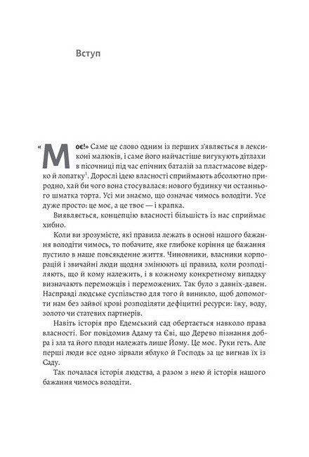 - Книжка розповідає про власність з кількох різних точок зору: економічної, соціальної, політичної, культурної, юридичної, психологічної. Тому читати її досить цікаво, щоб отримати повну картину уявлень про поняття власності.