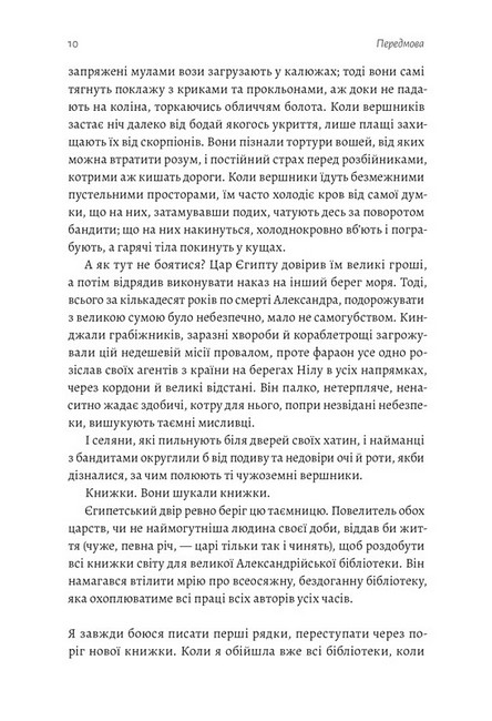 Це книжка про історію книжок — винахід перших людських цивілізацій. Щоб набути сучасного і зрозумілого нам вигляду, книжка мусила пройти шлях довжиною в кілька тисячоліть. Від глиняних табличок до першого друкарського верстата — авторка занурює читачів у мандри від давніх цивілізацій до сьогоднішніх часів. Маршрут цієї книжки пролягає через поле битви Олександра Македонського, віллу Папірусів під час виверження Везувію та палац Клеопатри, через перші відомі книгарні, ГУЛАГ, бібліотеку Сараєва та Оксфордський підземний лабіринт.