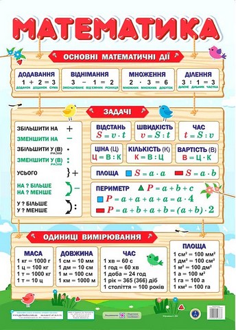 Плакат Математика Основні математичні дії Задачі Одиниці вимірювання Авт: О. Бучковська Вид-во: Пiдручники i посiбники 105036
