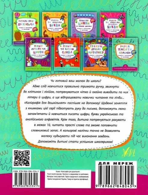 Крім того, у книзі є наліпки, які допомагають дітям засвоювати правильність написання літер та слова. Цей посібник сприяє розвитку моторики руки, покращенню навичок письма та створює позитивне ставлення до процесу навчання. Він є важливим інструментом у підготовці дітей до шкільного навчання та допомагає їм розвивати та вдосконалювати навички письма.