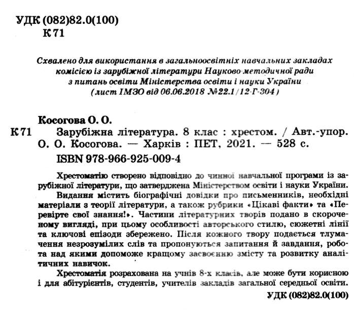 Хрестоматія Зарубіжна література 8 клас Нова програма Авт: Косогова О. Вид-во: ПЕТ 20855