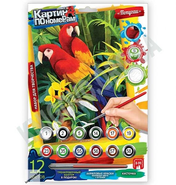Картина по номерам Попугаи Код: KN-01-02 Danko Toys. Закрашивая поочерёдно все пронумерованные зоны, соответствующими цветами, вы получаете готовое изображение настоящий шедевр профессионального художника, а сам процесс рисования доставит вам большое эстетическое удовольствие.