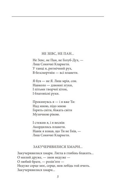 До видання ввійшли ліричні твори поета з його перших збірок. У своїх віршах П. Тичина сміливо ламає звичні ритми, знаходить несподівані рими, наближаючи поезію до музики. Його рання лірика вражає свіжістю емоцій і почуттів, повнимрозчиненням у природі, натхненним єднанням кохання та світу, піднесеним настроєм оспівування нового життя й щемкою надією на світле майбутнє. За словами В. Стуса, «Сонячні кларнети» П. Тичини «засвідчили психологічнийстан людини, повної сподіваної радості… перед звершенням. Це стан розкошування людської особистості на розгородженійтериторії існування, особистості, вивільненої від старихканонів, особистості в час первотворення і особистостіпередовсім».