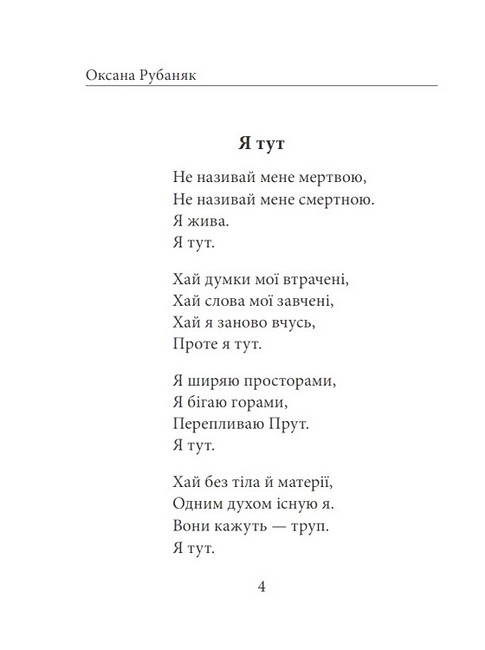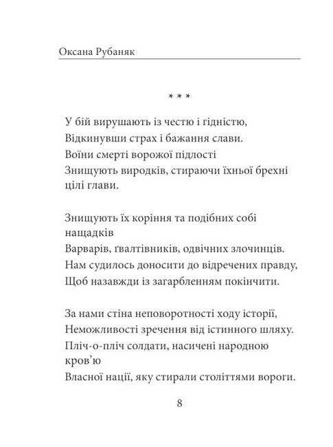 Вірші Оксани у цій збірці переважно про війну. З 19 років вона захищає Україну на передовій.