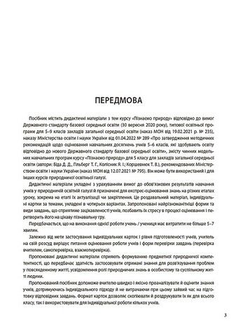 Посібник містить 120 дидактичних карток до курсу «Пізнаємо природу» (5 клас), призначених для поточного формувального експрес-оцінювання знань учнів на різних етапах уроку, зокрема на етапі актуалізації чи закріплення знань. Може бути використаний під основні теми різних модельних програм (автори: Біда Д. Д., Гільберг Т. Г., Колісник Я. І.; Коршевнюк Т. В.).