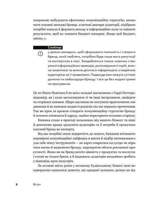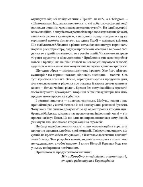 Будь-який бізнес матиме успіх лише тоді, коли завоює лояльність широкої аудиторії. Без грошей і хитрощів — за допомогою правди й ефективної системи комунікацій. Перед вами книжка, яка допоможе це зробити. Авторка докладно інформує, як самотужки розробити комунікаційну стратегію та втілити її в життя незалежно від ніші й наявності чи відсутності бюджету на просування. Ціла низка корисних і зрозумілих схем, таблиць, інформативних практичних порад та професійних секретів, якими щедро ділиться авторка, вам у поміч. Завдяки QR-кодам ви матимете змогу одразу завантажити їх у смартфон і використовувати для своєї роботи.