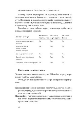 Спираючись на широкий практичний досвід, автори пропонують конкретний набір інструментів, що заощадить ресурси, допоможе у вирішенні спорів і стане путівником для нових бізнес-проєктів. Автори чітко й професійно систематизують усі виклики партнерства, на які варто зважати перед ухваленням рішень і підписанням партнерської угоди. Прочитавши книжку, ви будете підготовлені до цих викликів та зможете мінімізувати ризики.