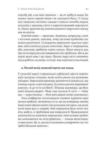 - Наповнена історіями лідерства, що демонструють безліч способів, якими основні ідеї «П’ятої дисципліни» (багато з яких здавалися радикальними під час першої публікації) стали глибоко інтегрованими у світогляд людей та їхні управлінські практики.
