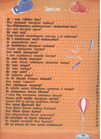 Тут читач знайде цікаві відомості про історію цього виду спорту і боксерского екіпірування, цікавинки про найважливіші бої та арени, про легендарних боксерів.