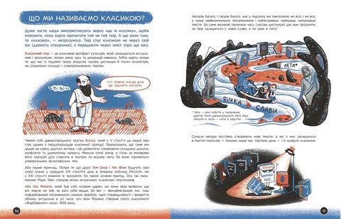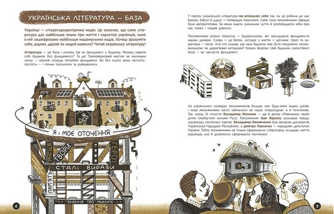 \nТут авторка Анастасія Євдокимова — літературознавиця, культурна менеджерка, а в минулому вчителька української літератури — розповідає про жанри, форми, тематику творів, про долі й характери митців. І зрештою показує, як усе-усе довкола (епоха, погода і навіть страви в меню) впливає на те, що писали й пишуть наші письменники. Що таке класика? З чого складається детектив? Як читати комікс? Книжка пояснює поняття з літератури на прикладах українських творів. А кожна сторінка тут — ніби захопливий мультфільм, адже ілюстрації створила художниця-мультиплікаторка Софія Мельник.