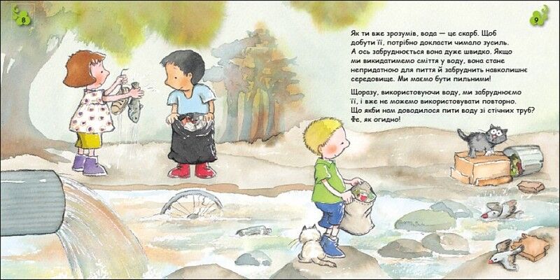 «Турбота про планету» — нова серія екокнижок! Вода дуже важлива для життя людей, тварин і рослин. Проте її запаси не безкінечні. Саме тому ми маємо берегти воду. У цій книжці ти дізнаєшся, чому вода така важлива і як можна допомогти річкам, озерам і морям стати чистішими. Подбаймо про нашу планету! Окрім пізнавальної інформації маленькі читачі знайдуть інструкцію до тематичних саморобок, як-от дощоміру. А в кінці книжки є підказки для батьків, які допоможуть більш ґрунтовно пояснити дитині прочитане. Подбаймо про нашу планету!