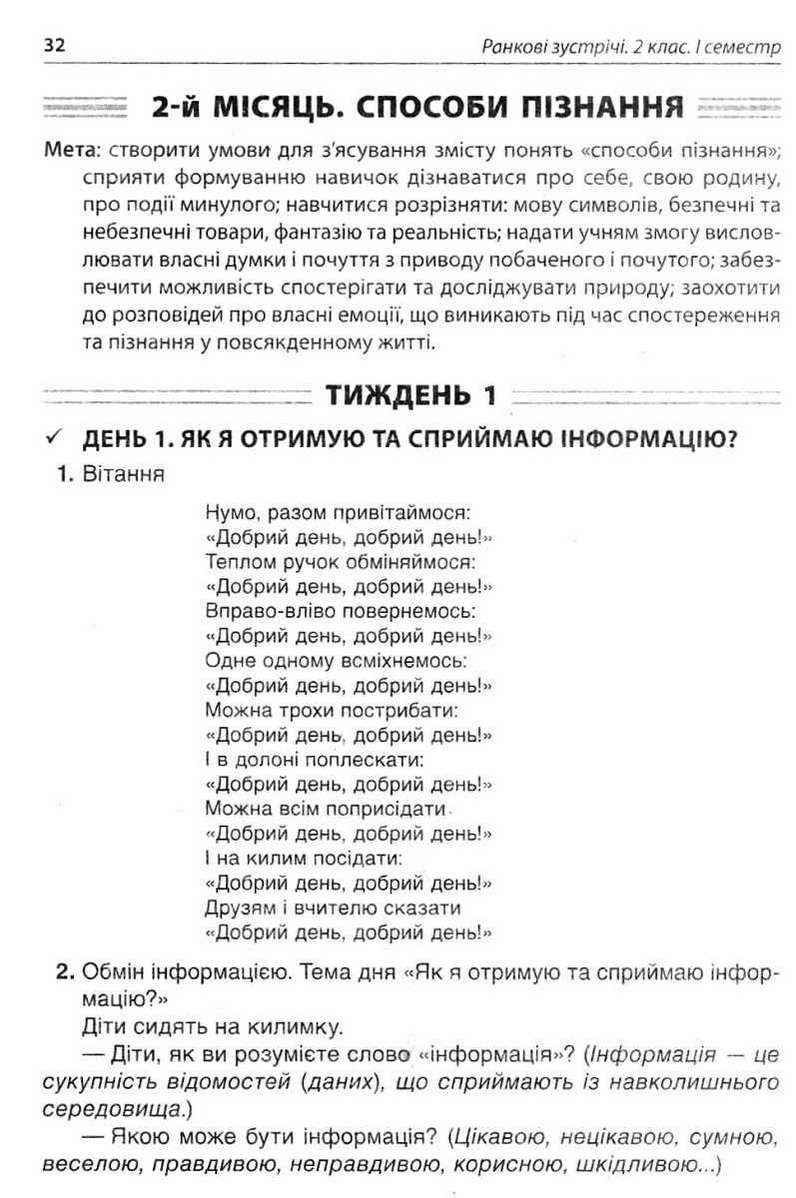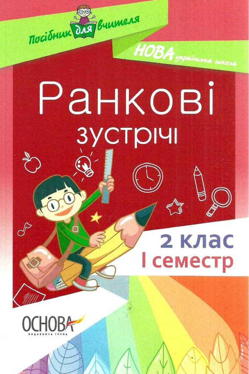 Посібник Ранкові зустрічі 2 клас I семестр Нова українська школа НУШ містить інформаційний методичний матеріал для підготовки і проведення ранкових зустрічей у 2-му класі, дібраний відповідно до Концепції Нової української школи, вимог нового Державного стандарту початкової загальної освіти. Матеріал систематизовано за темами місяців I семестр: Зміни, Способи пізнання, Територія, Спільнота.